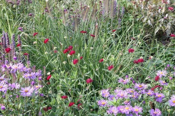 Aster x frikartii 'Jungfrau' en Knautia macedonica
